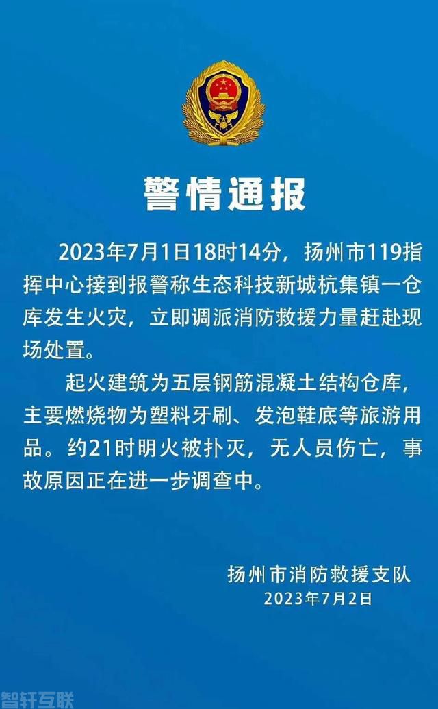 在火发生后,扬州市消防支队及时发布警情通报,向社会公众传递了相关. 这种及时通报可以提高公众火防范意识,让大家了解到火危害和防范措施,从而减少火发生.